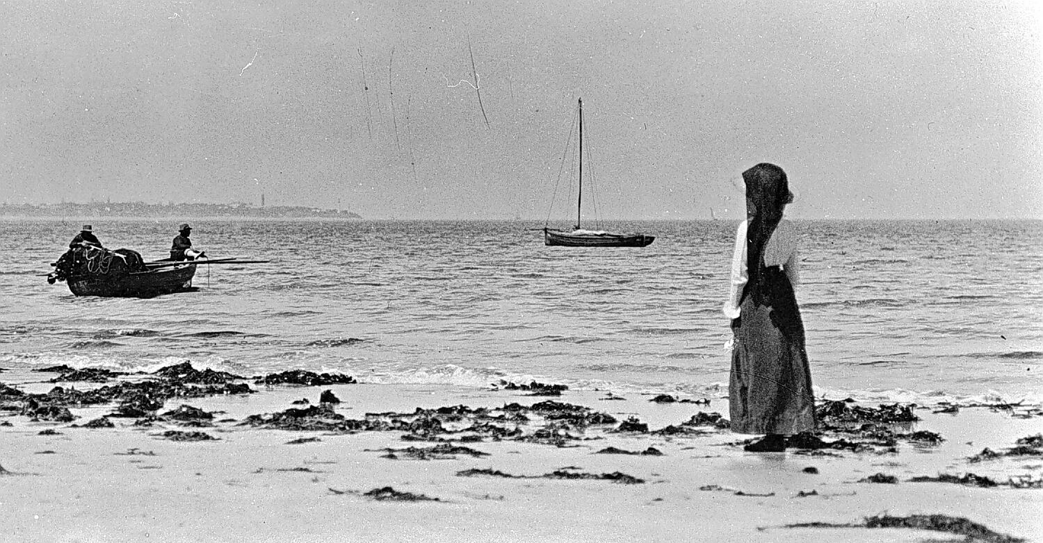 A woman, wearing a veil, on the beach with a row boat coming in on the left and a moored sailing boat in the background.