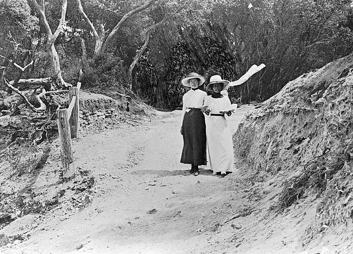 Two women on the 'Spooks' footpath. The women are wearing hats and dresses typical of the Edwardian era, and one woman is wearing glasses.
