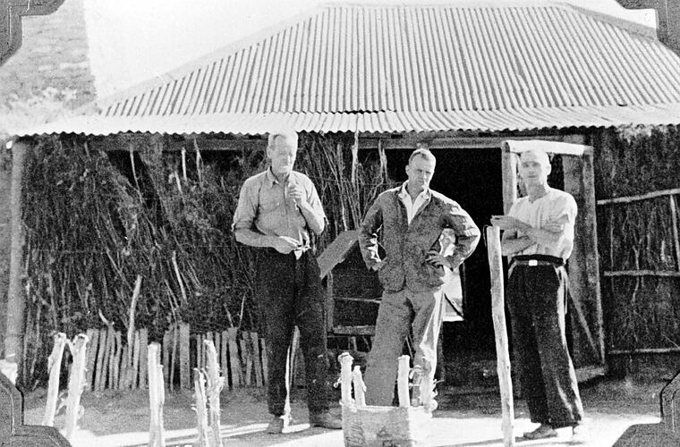 Three men outside a hut which has corrugated iron roof and brush walls.