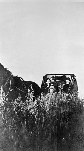 A horse and carriage in an oat crop. The carriage contains a woman with two small children and an elderly woman.
