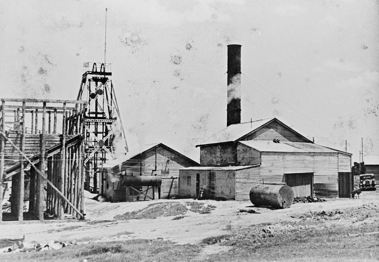The Buninyong Rand Gold Mine with ore bins, poppet head, winding house and boiler house.
