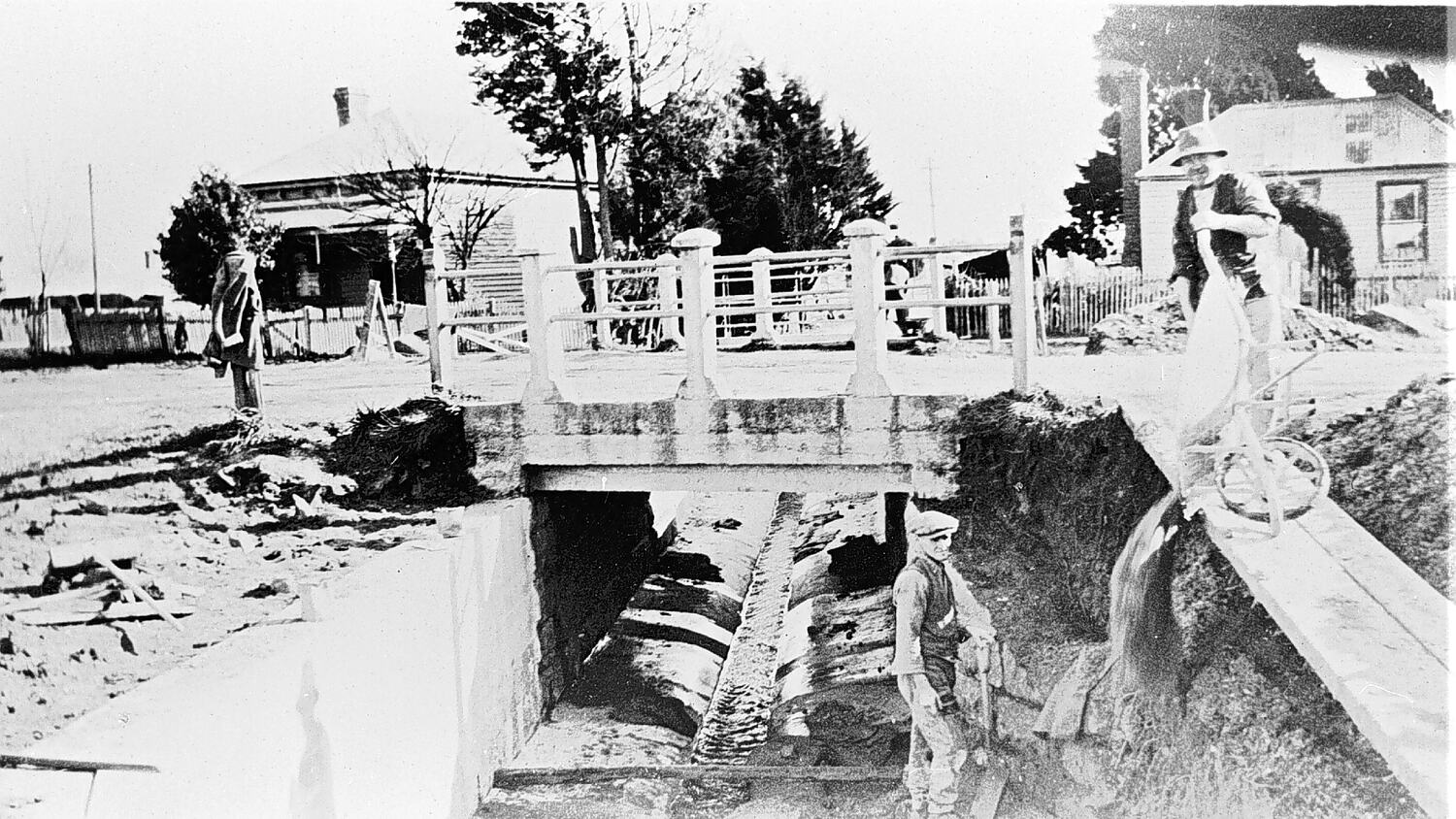Construction of concrete retaining walls for drainage works on Gnarr Creek. Workmen are pouring concrete. There is a bridge over the creek and a house in the background.