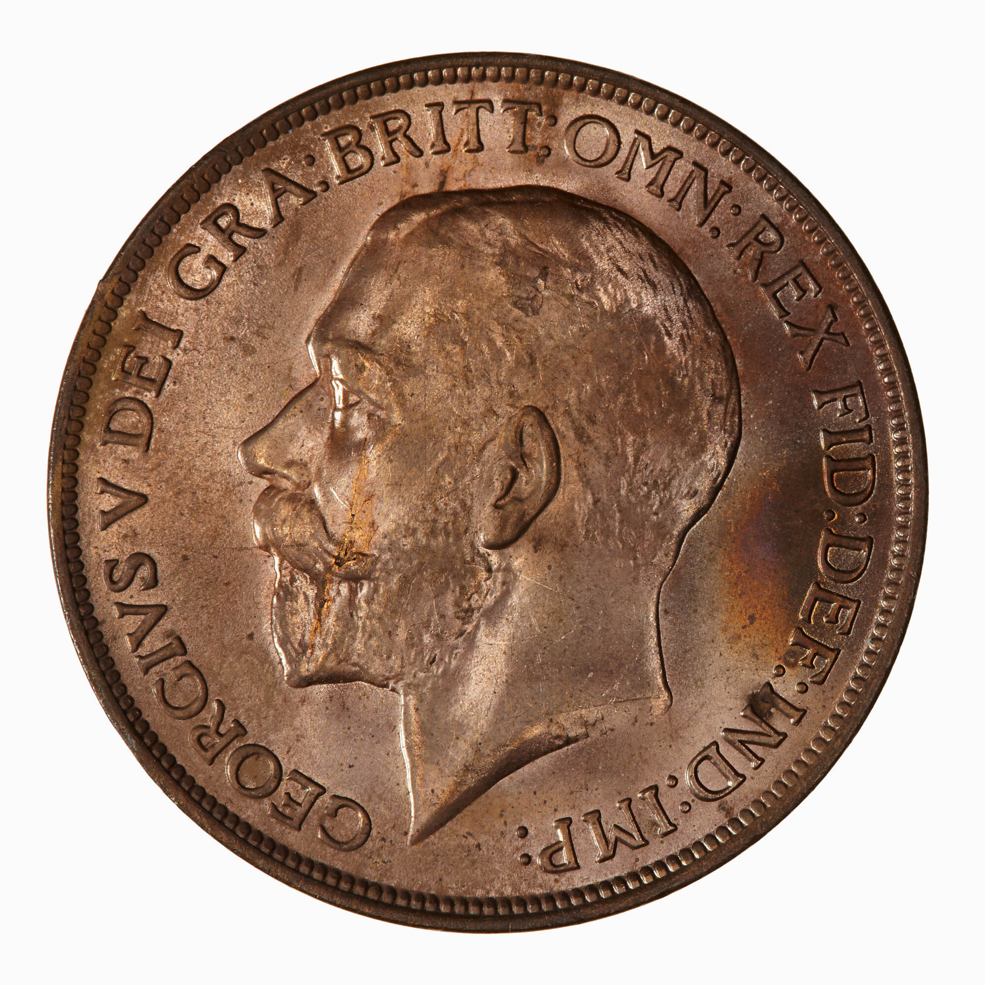 Bare head of the King facing left; below on neck truncation in small letters, B.M. (Bertram MacKennal); around, GEORGIVS V DEI GRA: BRITT: OMN: REX FID: DEF: IND: IMP: