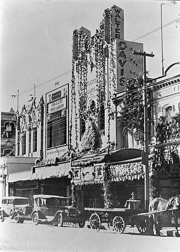 Shops decorated for the Ballarat centenary celebrations. The shops include: Carthews, Butchers, Gullan 's Newsagency and Walter Davis Proprietary Limited Ladies Fashions & General Drapers.