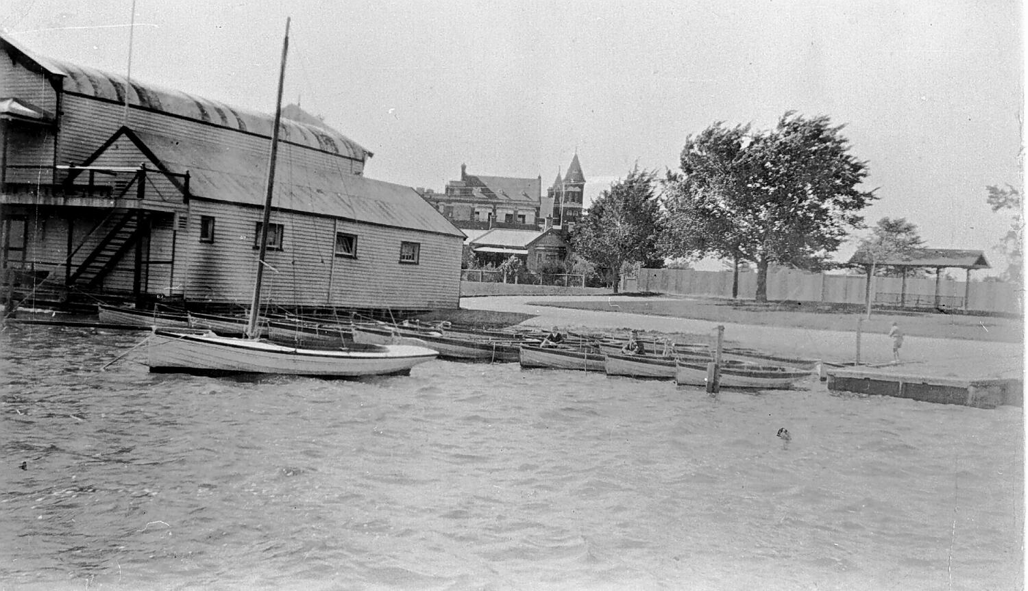 The fleet of rowing boats owned by D. A. Gill. Gill 's boat house on the left and Nazareth House in the background.