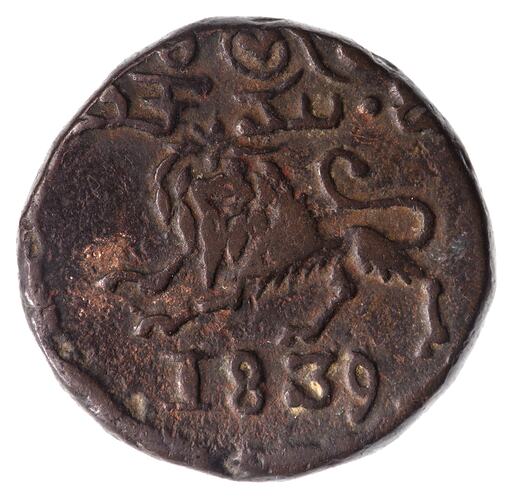 Crude lion advancing to left, right paw raised, head facing (sometimes called a Sardula Lion); above, legend (Sri chamundi); below, 1839