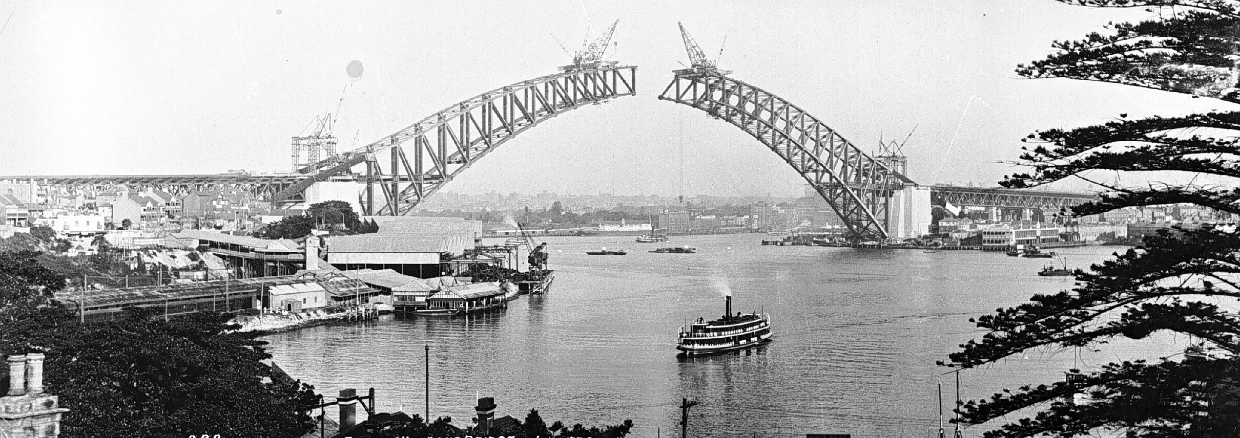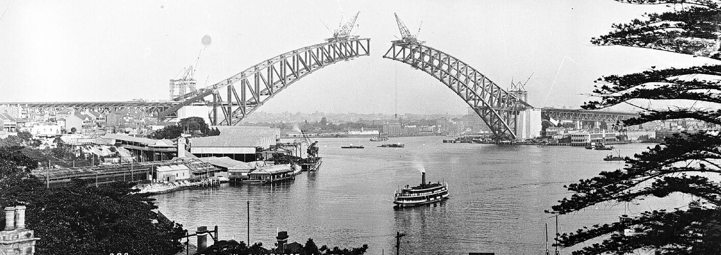 The arch of the Sydney Harbour Bridge nearing completion, there is a ferry in the foreground.