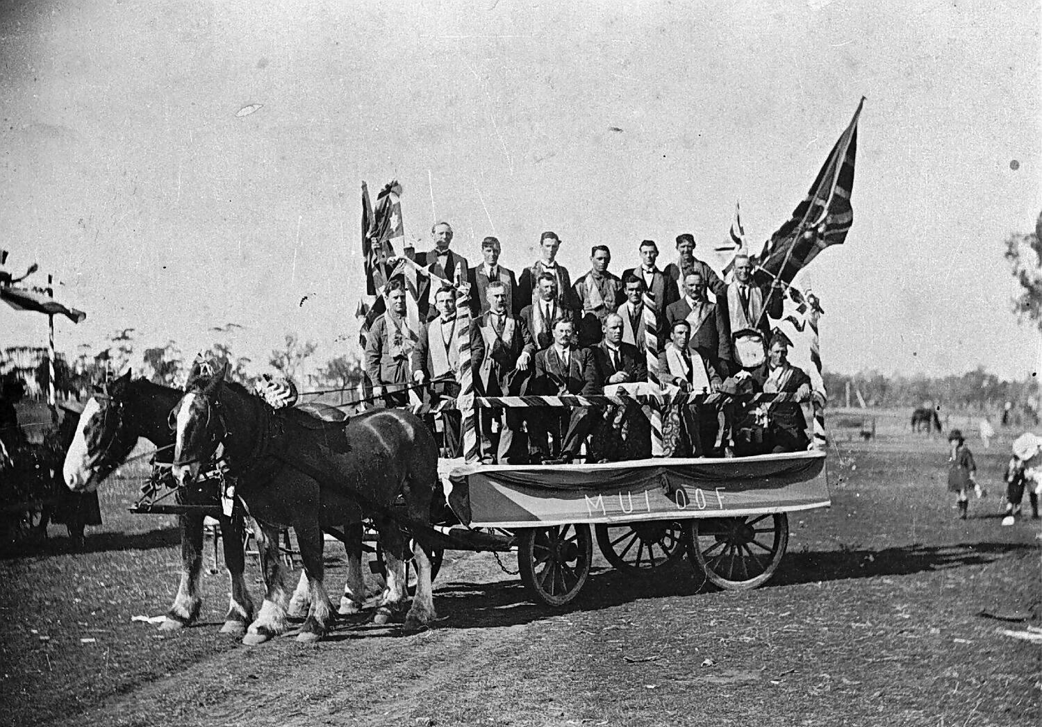 Members of the I.O.O.F. on a parade float drawn by two horses.