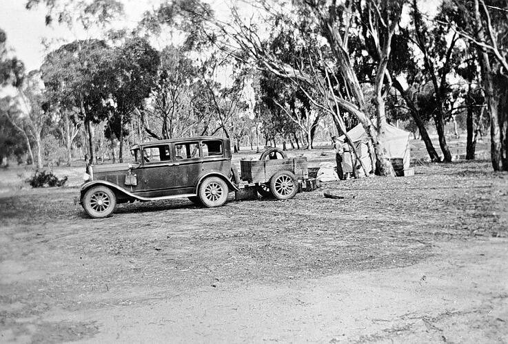 A De Soto car and trailer at camp on the Stawell Reserve.