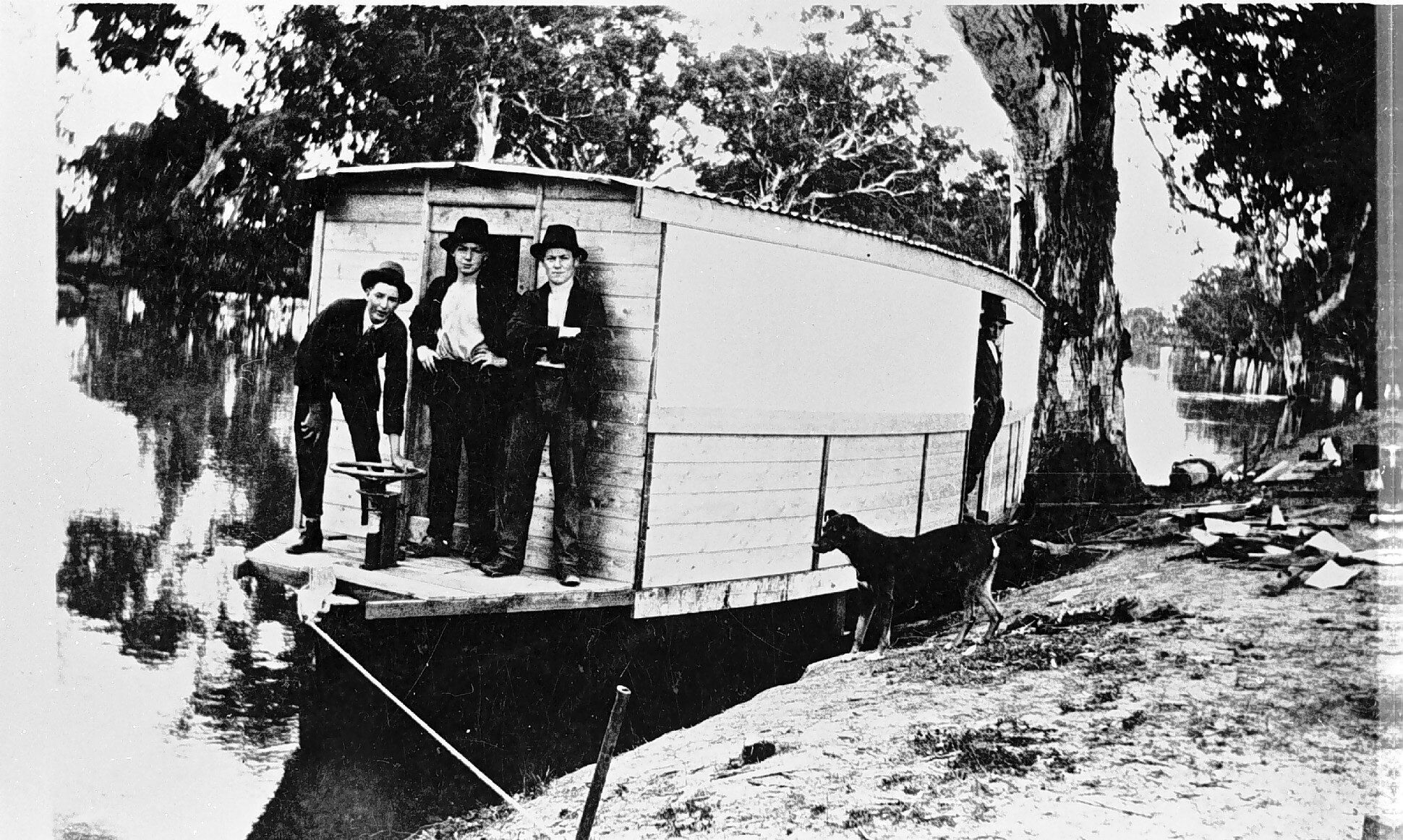 Four men on a houseboat tied to the bank of the Murrumbidgee River.