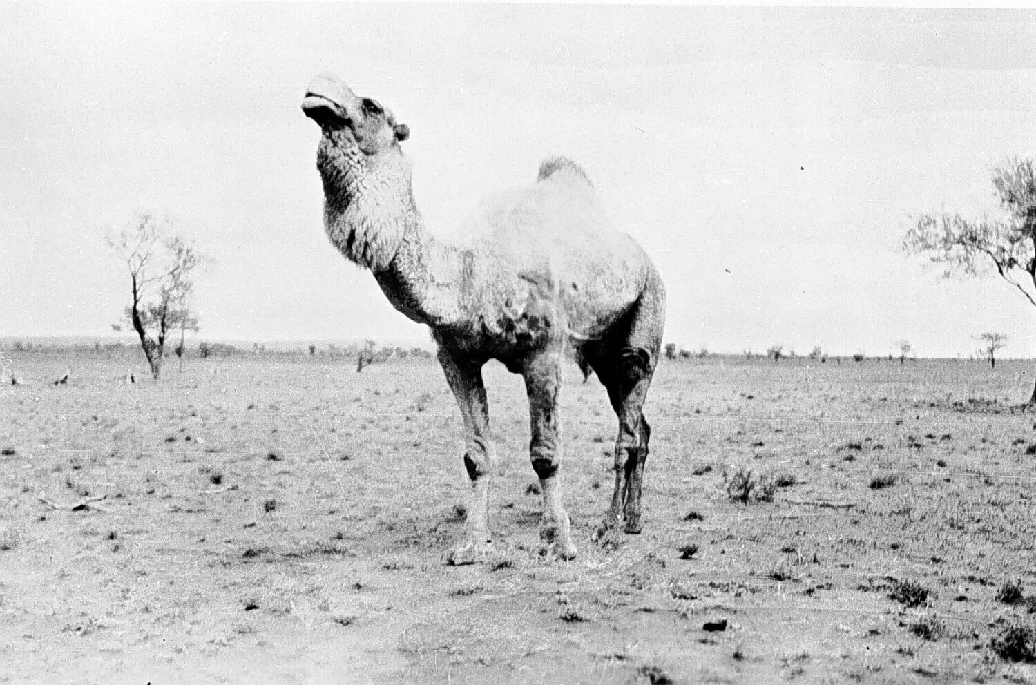A wild Bull camel on Momba Station in the White Cliffs District of New South Wales. Dated to circa 1935.