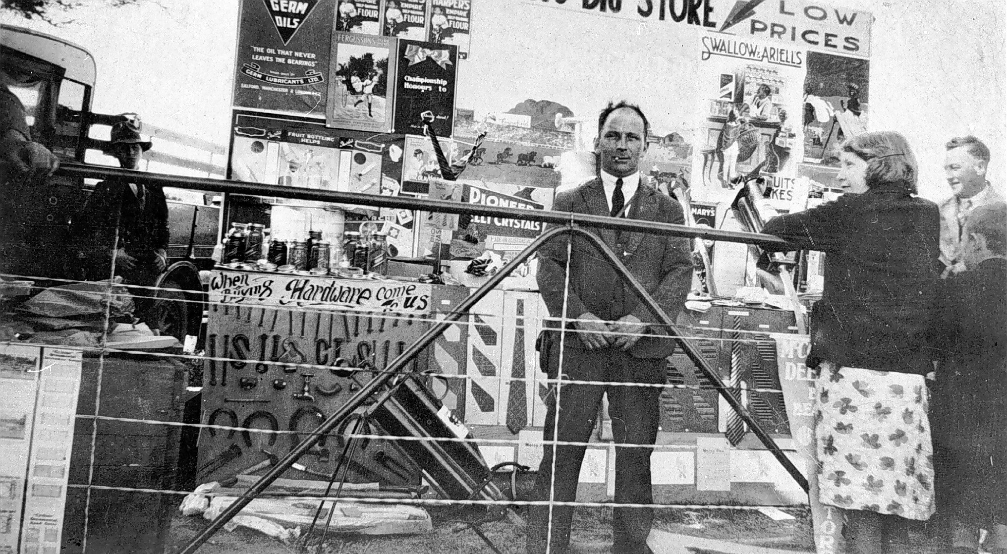 Display for a general store at the R & A Showgrounds. The sign at the top of the photograph has been cut off but appears to read '...ys big store, low prices'. As the man's name is'Homfrays' this is assumed to be the name of the store.