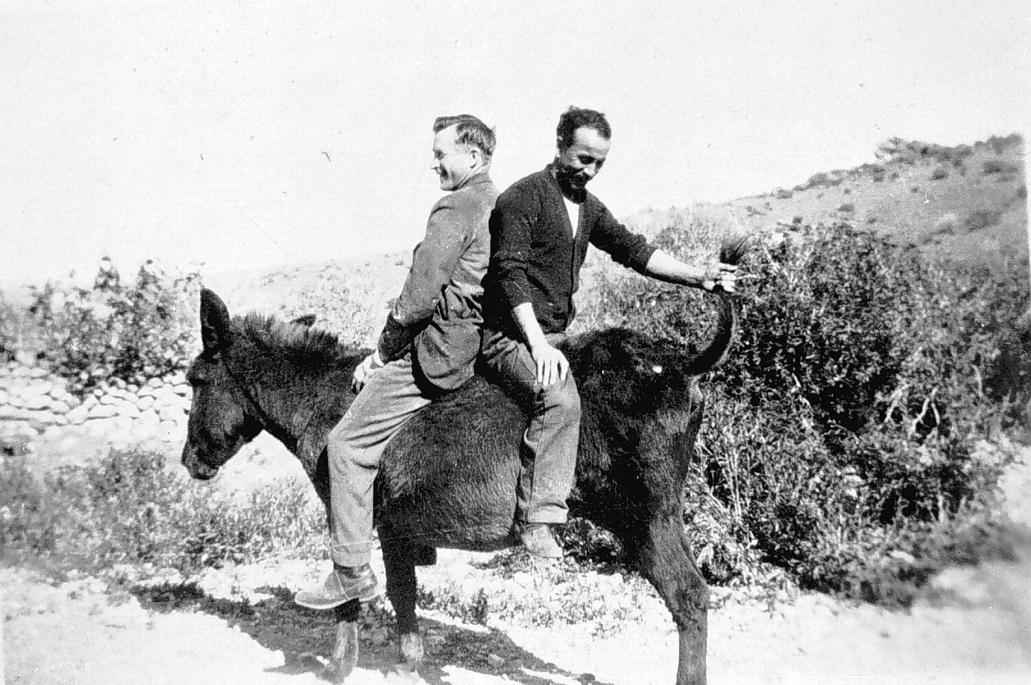 Two men seated back to back on a horse. One man holds the horse 's tale. The photograph was taken on'Siam' station.