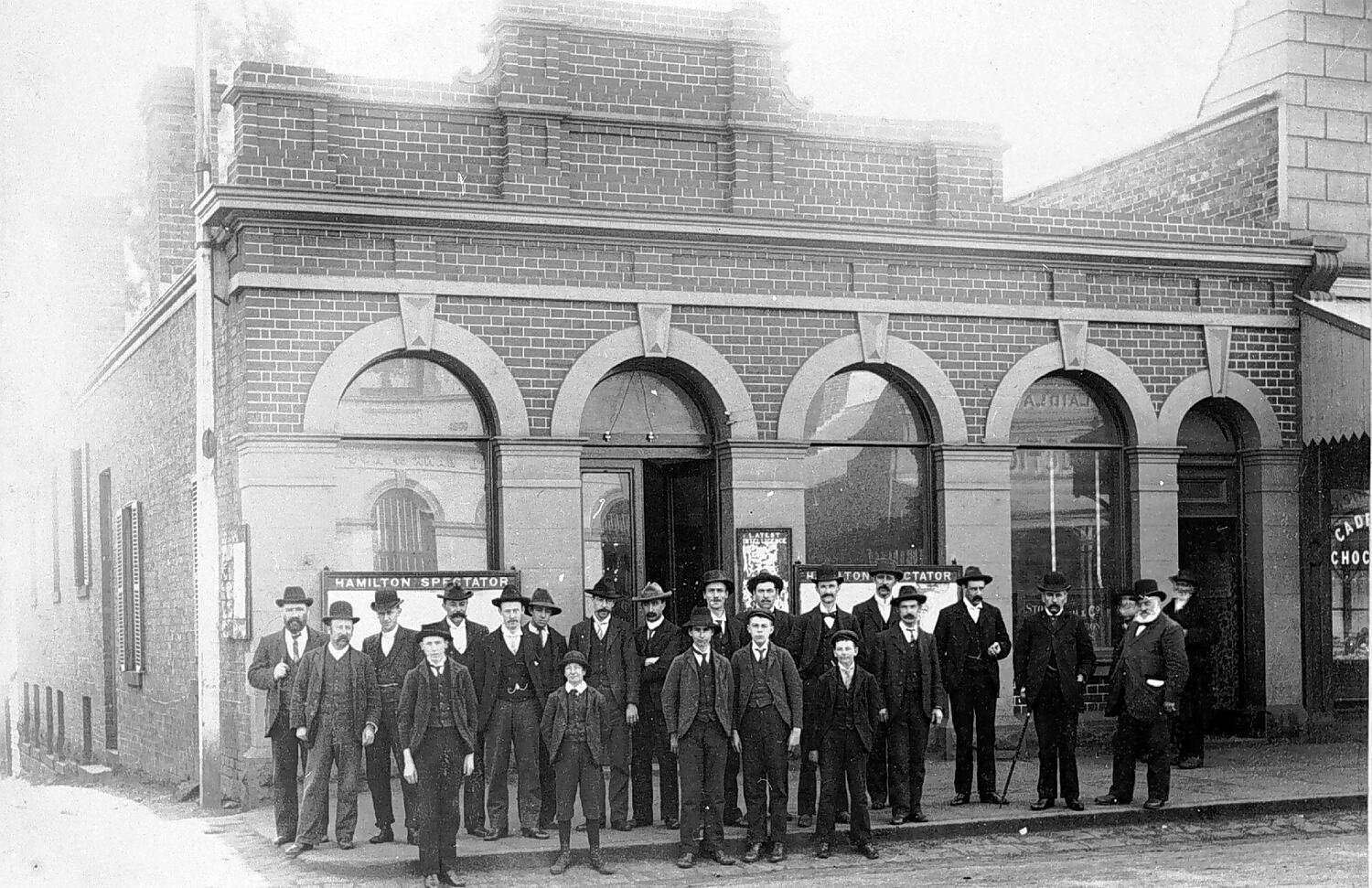 Staff standing outside the 'Hamilton Spectator' newspaper office.