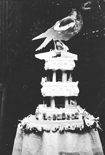 A cake made to commemorate four consecutive premierships by the Collingwood Football Club. The magpie was wooden and measured 40cm by 34 cm. The Kewpie dolls around the base represented the members of the team. The multi-tiered cake was the centrepiece on the banquet table.