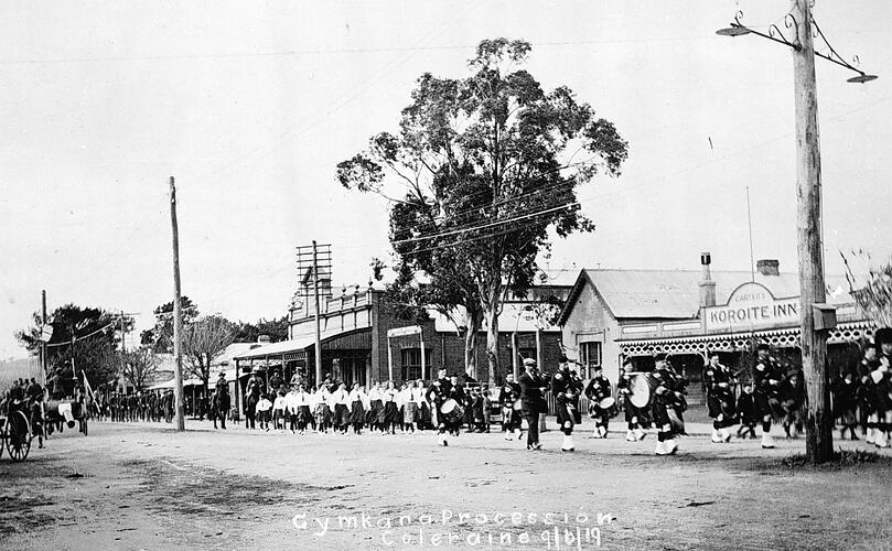 Gymkhana parade with the Koroite Inn and Trangmars Shop in the background.
