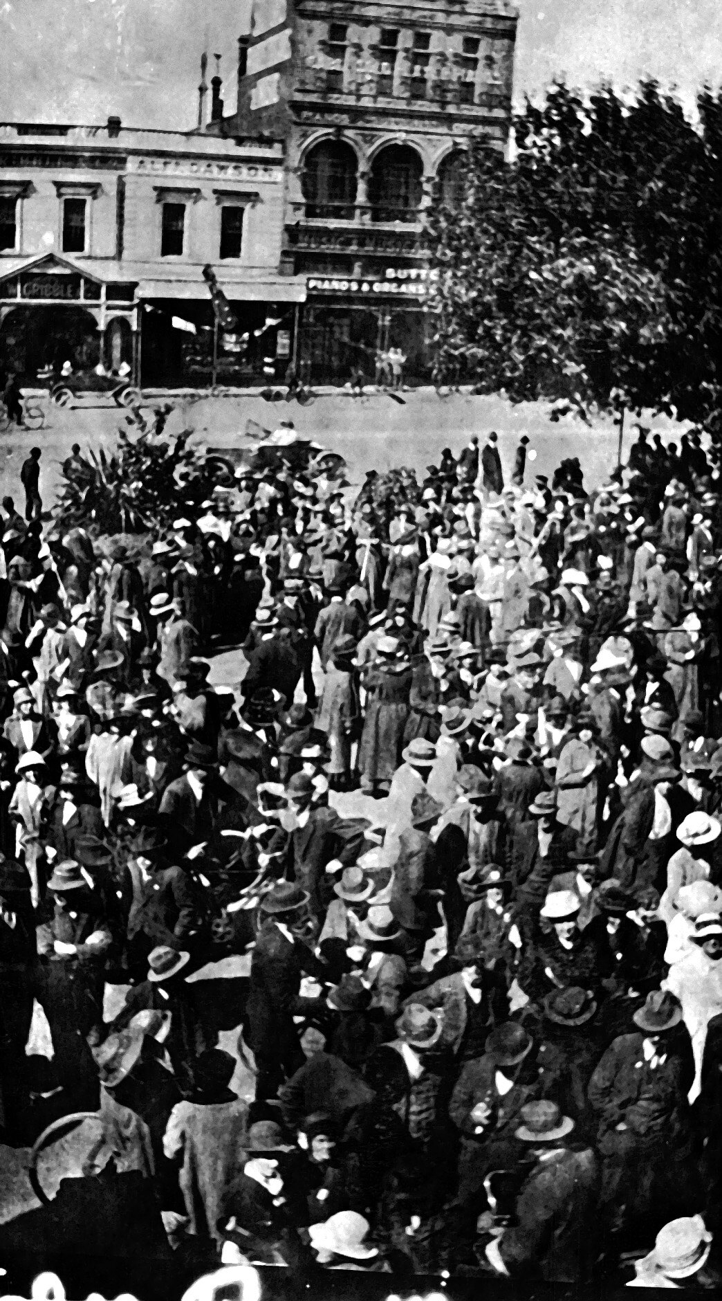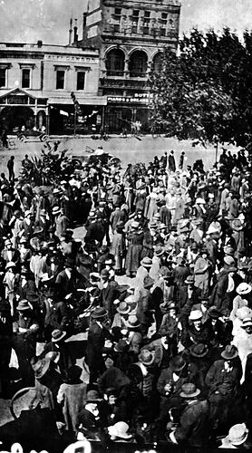 Crowds outside the 'Courier' office in Ballarat. There had been an incorrect announcement of an armistice on the 8th November. In the background, Sutton's Music Store and Gribble the tailor.