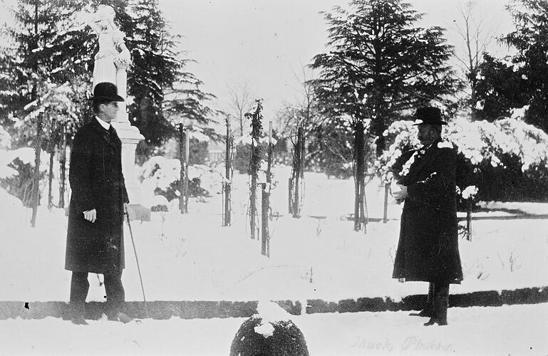 Two men standing in snow in the Ballarat Botanical Gardens.