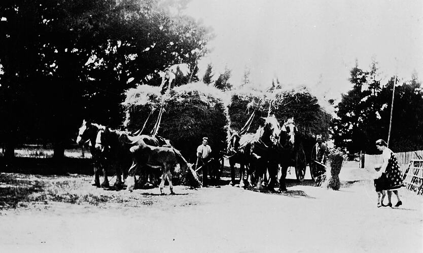 Horse teams carting hay on 'Kooringal' station.