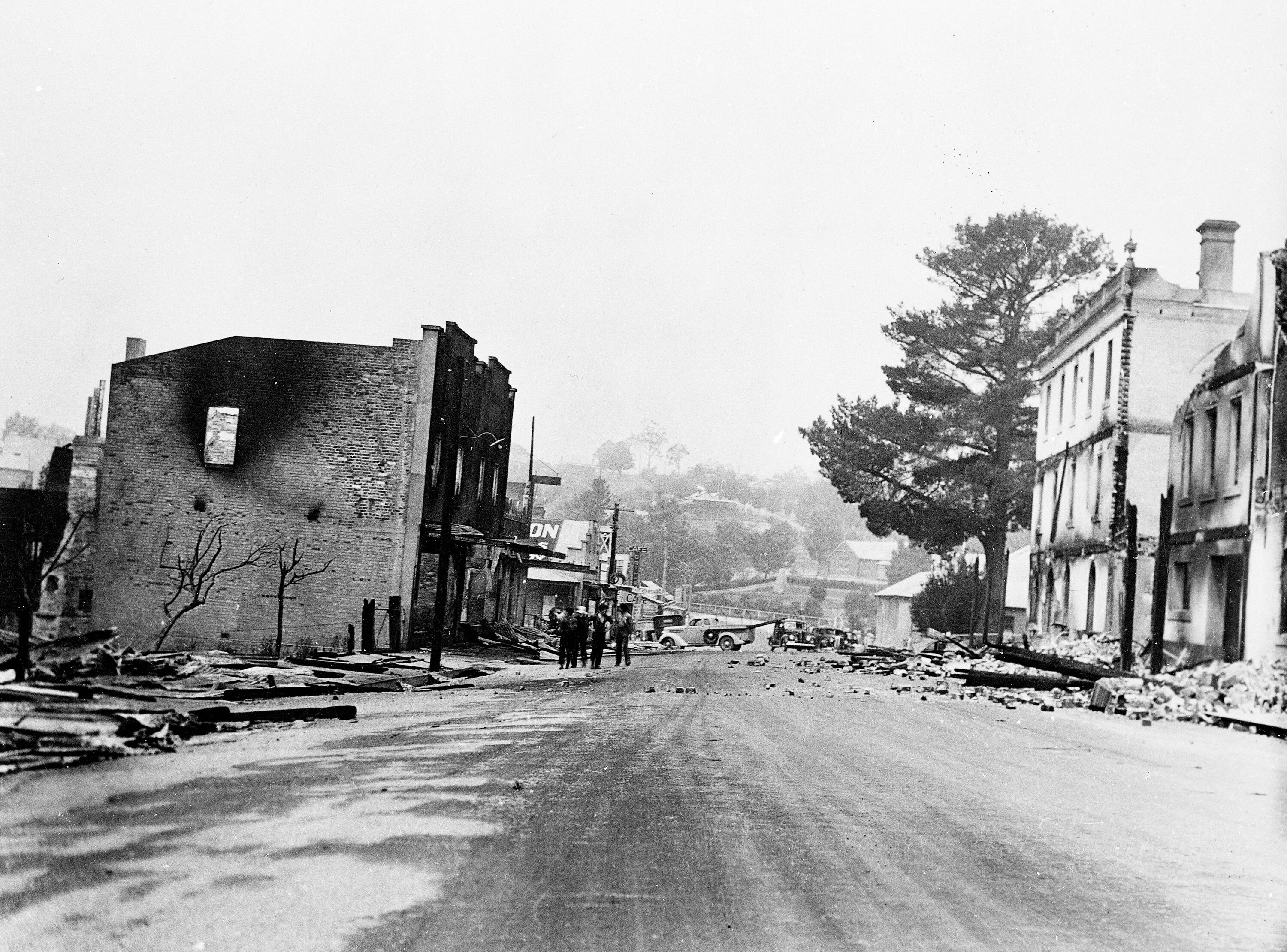 Fires, Hotels, Motor Cars, Motor Trucks, Natural Disasters, Ruins, Townships, Bushfires