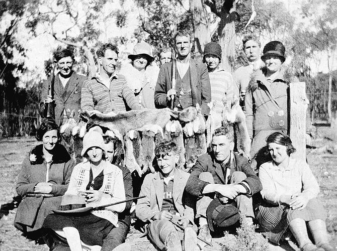 A group with firearms, fox skin and rabbits. Back Row: Arthur Malham, Ern Hull, Lis Robinson, Ern Robinson, not known. Front Row: Dolly Malham on left, and Bill Woods who is second from the right. The others are unknown. Information kindly supplied by Ern Robinson's grandson in November 2011: "Ern (Ernest) was my grandfather who passed away in 1971. Lis (Elizabeth) was one of his many sisters (he had 15 brothers and sisters). Arthur and Dolly Malham were related by marriage to the Robinsons."