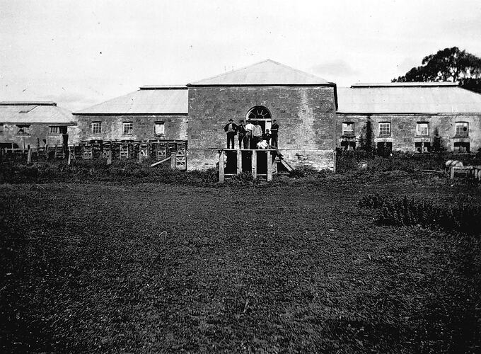 A group standing in front of a large brick woolshed on 'Warantenbullie' station.