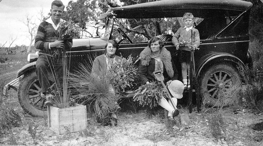 A man, two women and a young boy collecting plants in the bush. The women are sitting on the running board of a car while the man sits on the front fender. The young boy holds a rifle.