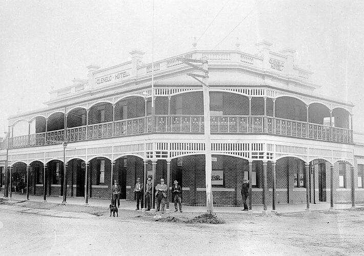 A group of men outside the Glenelg Hotel.