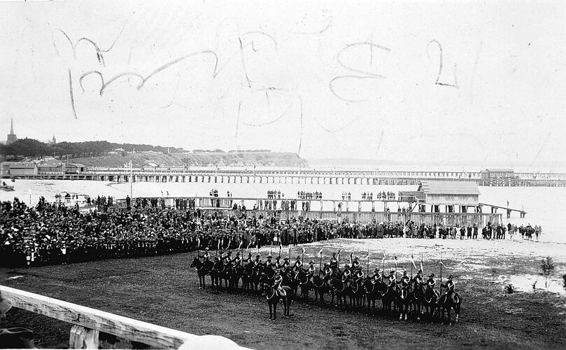 Troopers on horseback as part of the Portland centenary celebrations. They are drawn up in review on open ground and are watched by a large crowd there are jetties in the background.