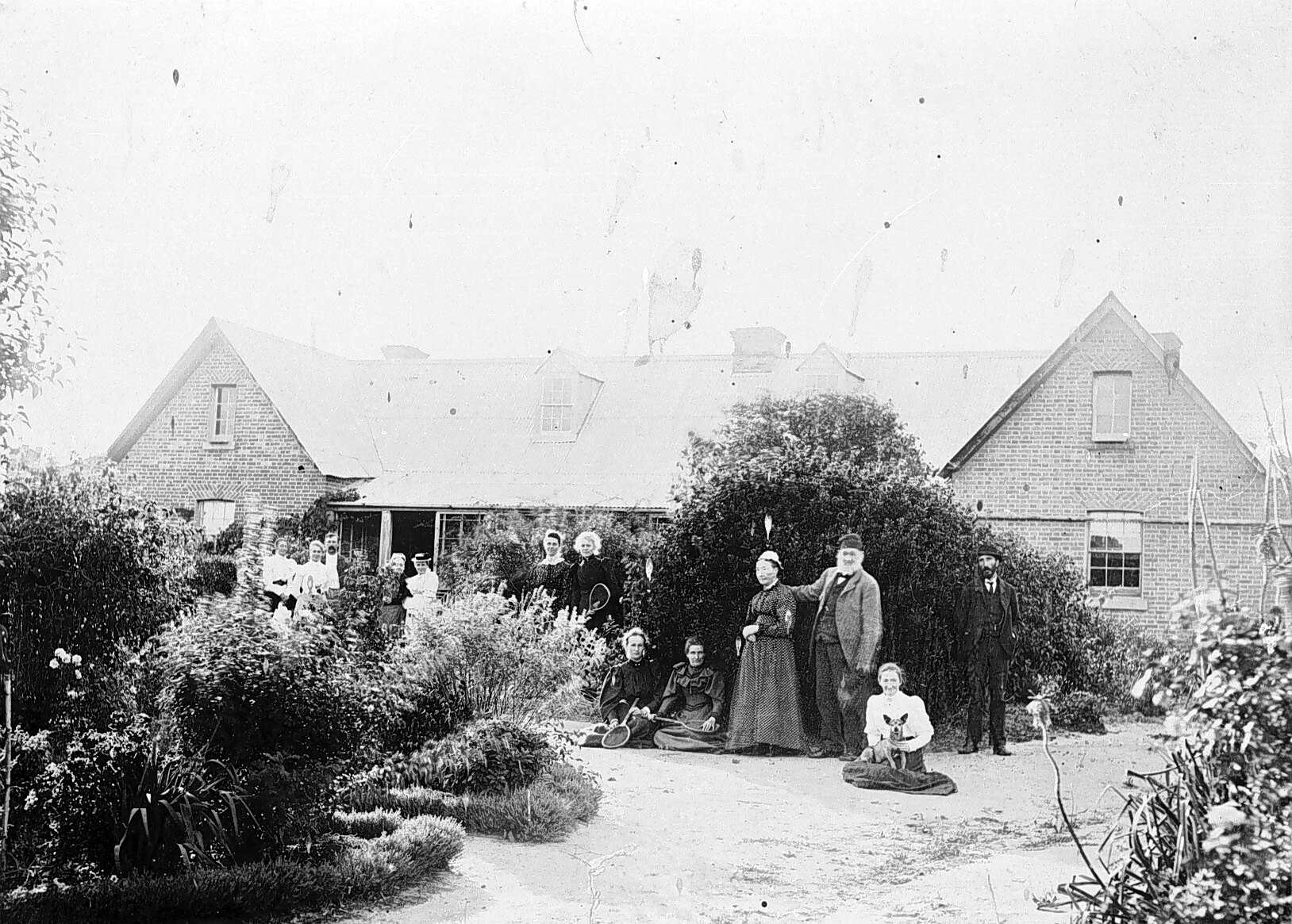 A group of people in the gardens at 'Pine Hills' homestead. They were attending a tennis party.