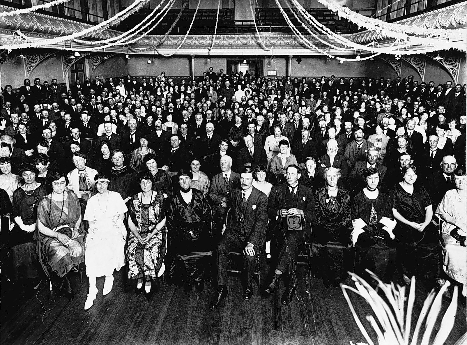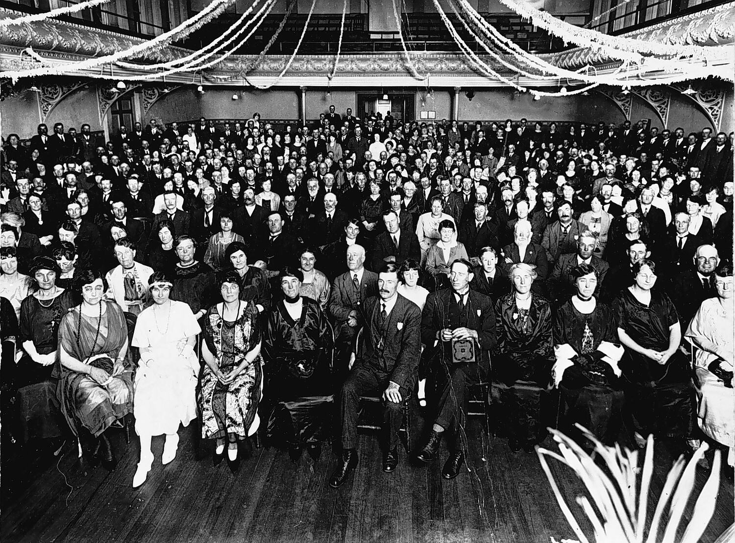 A view from the stage of the audience in a large public hall. The hall is decorated with streamers and the women appear to be dressed for a special occasion.