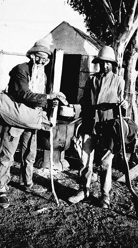 Two women in fancy dress. They are dressed as swagmen.