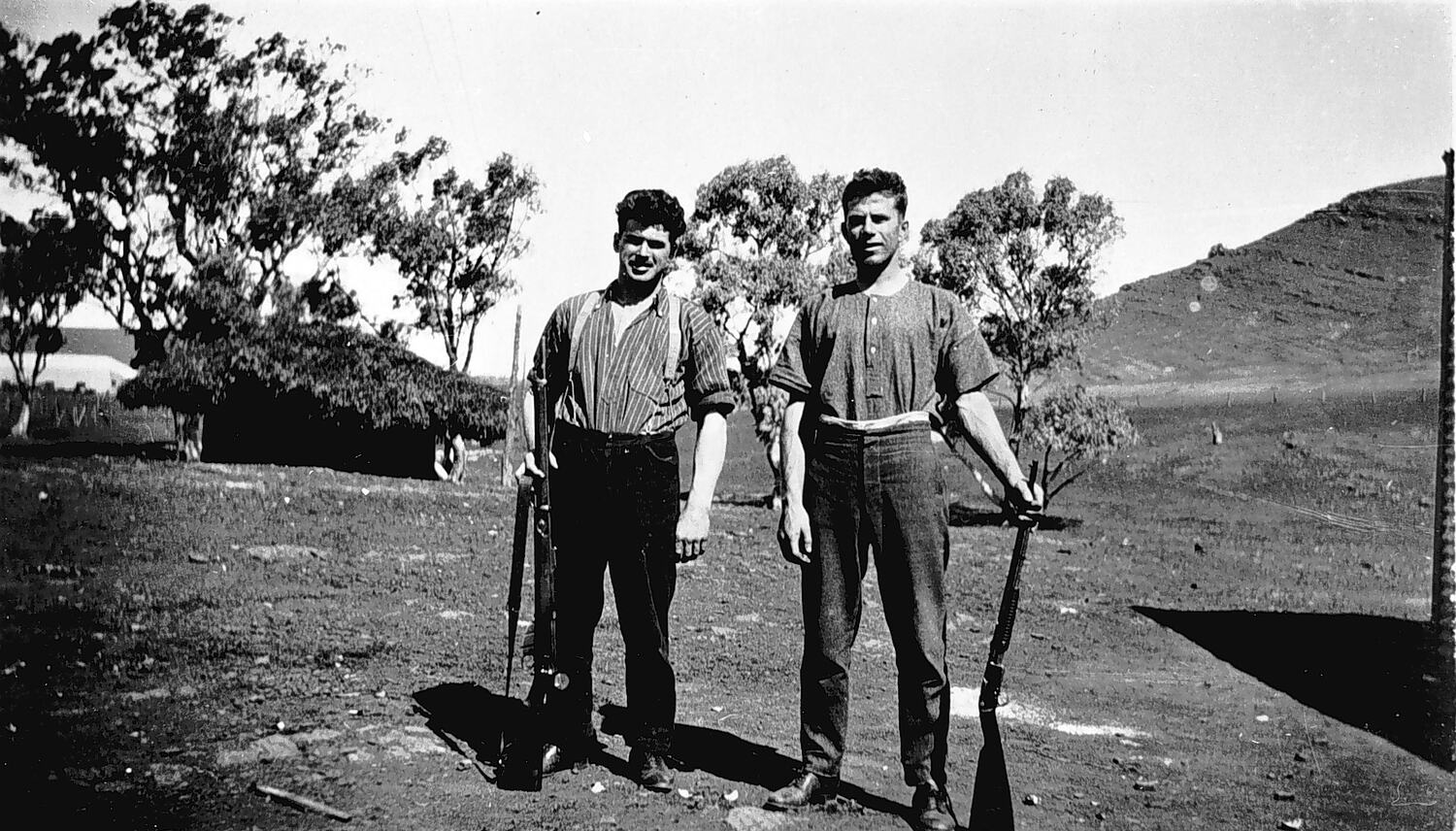 Two men with guns. There is a building with a thatched roof in the background.