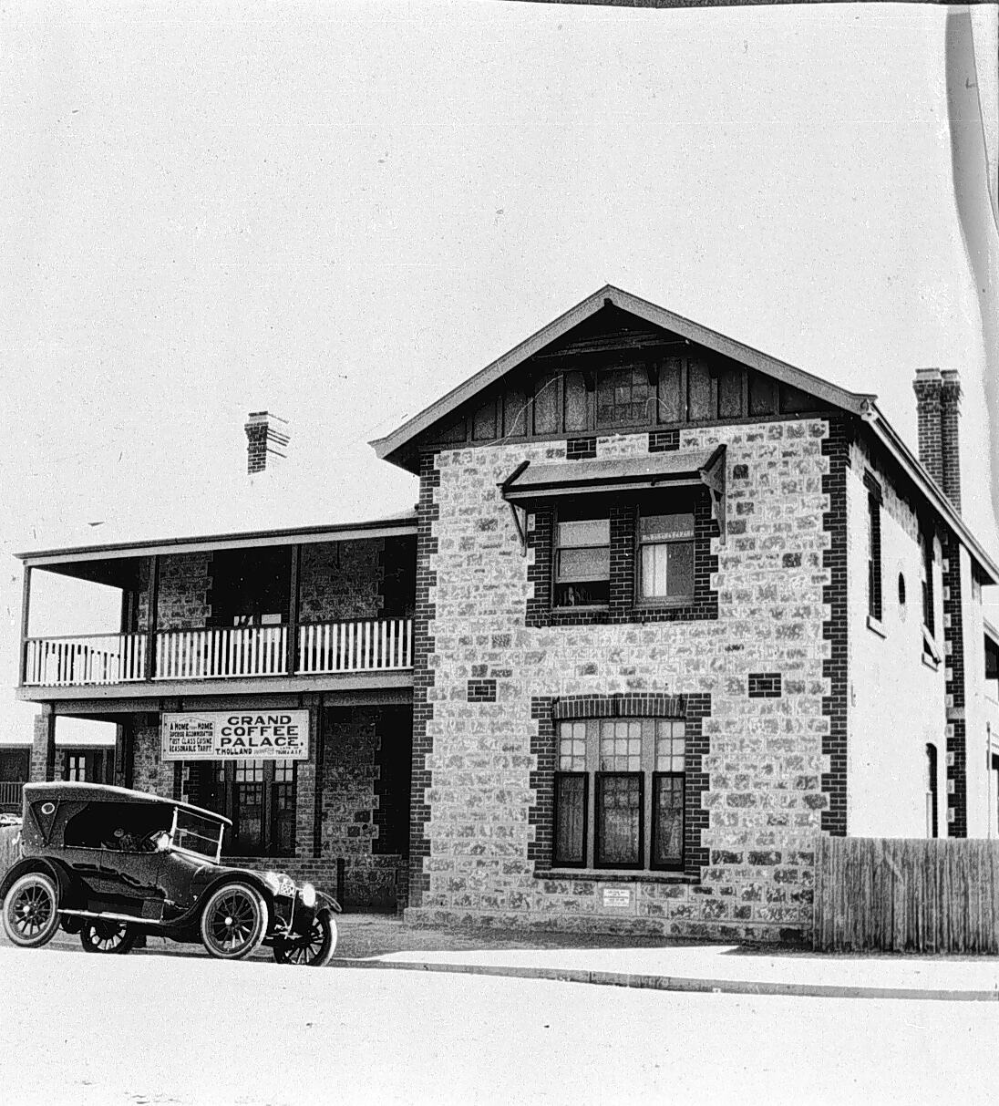 A car parked outside the Grand Coffee Palace. The coffee palace is a two storey stone building.