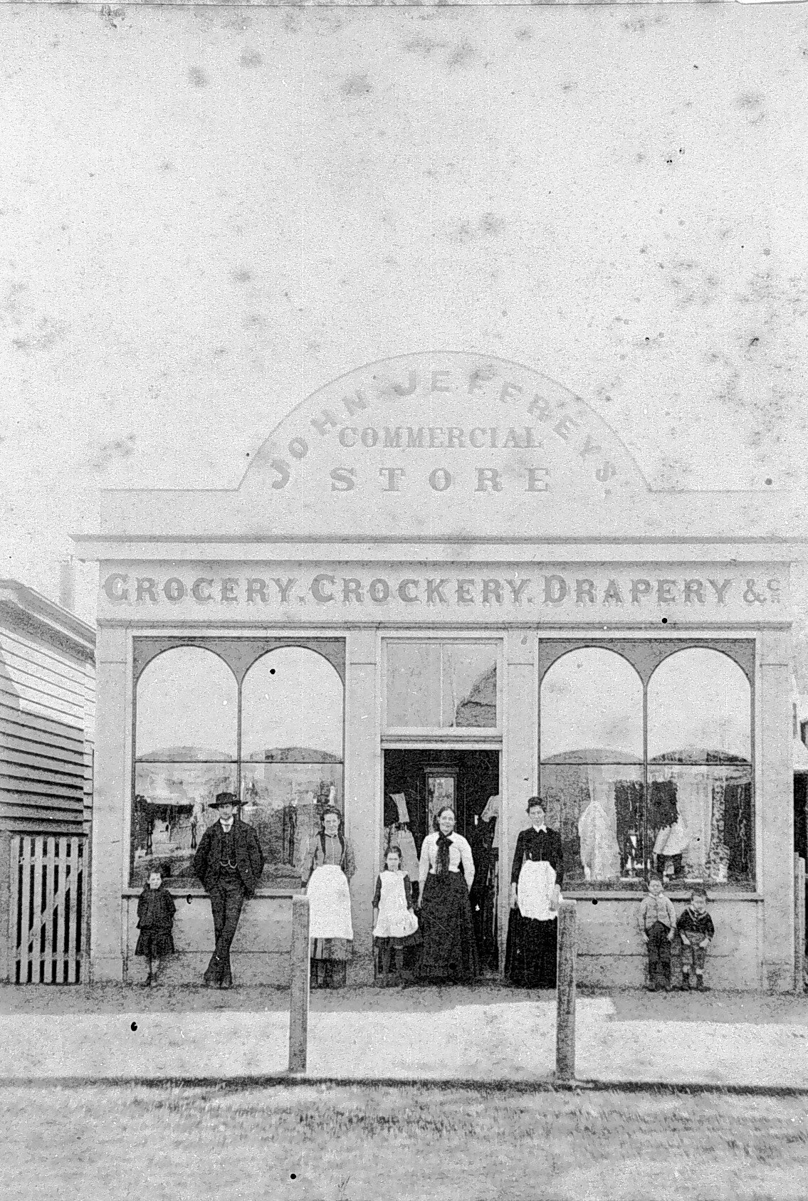 A group of people standing in front of John Jeffreys Commercial Store, Grocery, Crockery, Drapery &c.