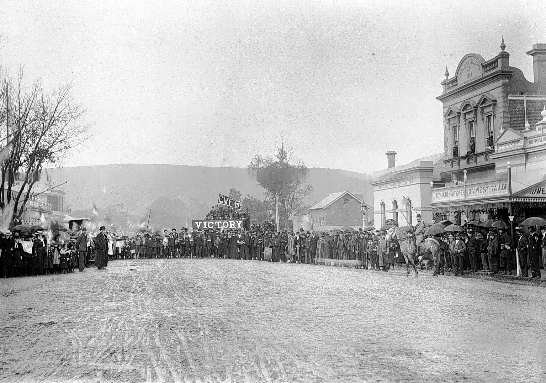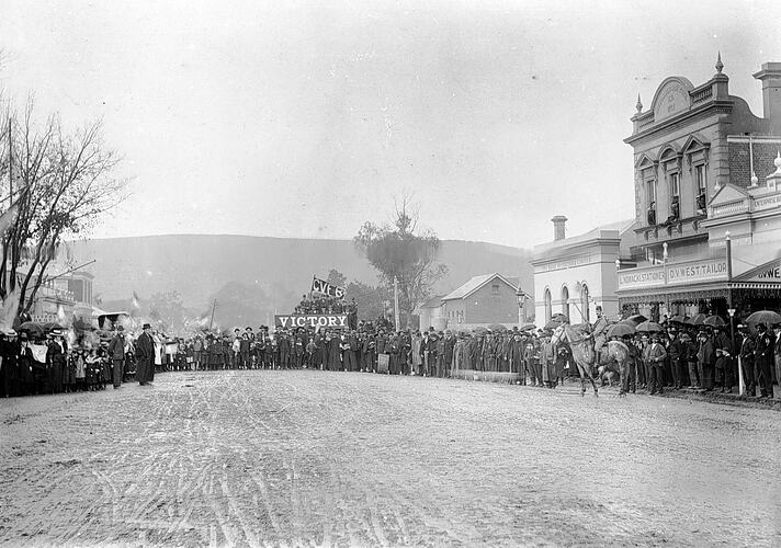 Crowds at a celebration in Henty Street. Two signs read 'Victory' and 'CVF B' (Citizens Volunteer Force?). There is an officer on horseback on the right. This celebration was presumably marking an event in the Boer War.