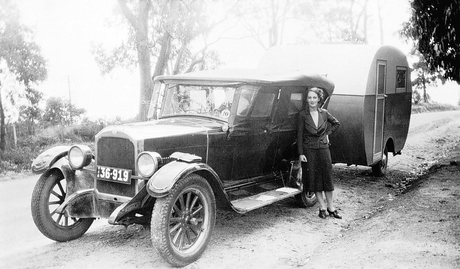 A woman standing beside a Rugby 6 cylinder motor car and a 'Don' caravan.