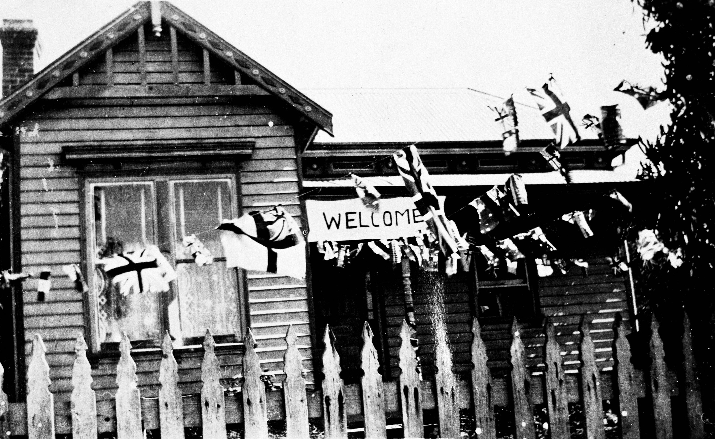 A house decorated with flags, bunting and a welcome sign for a returning soldier.
