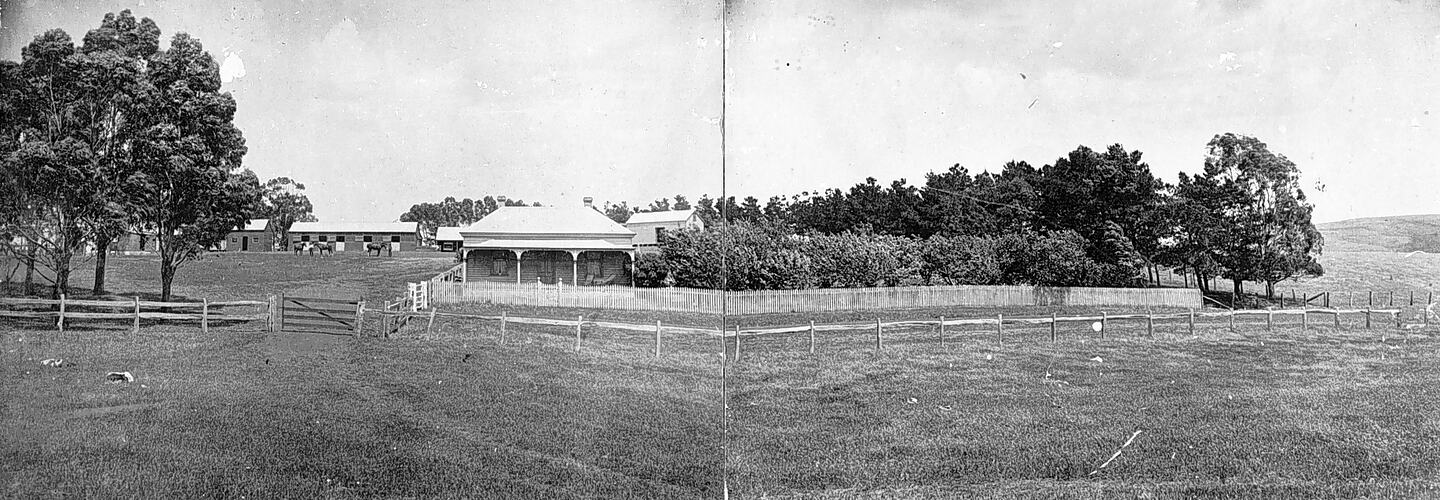 A panoramic view of the original homestead on 'Moredun Hill' station.