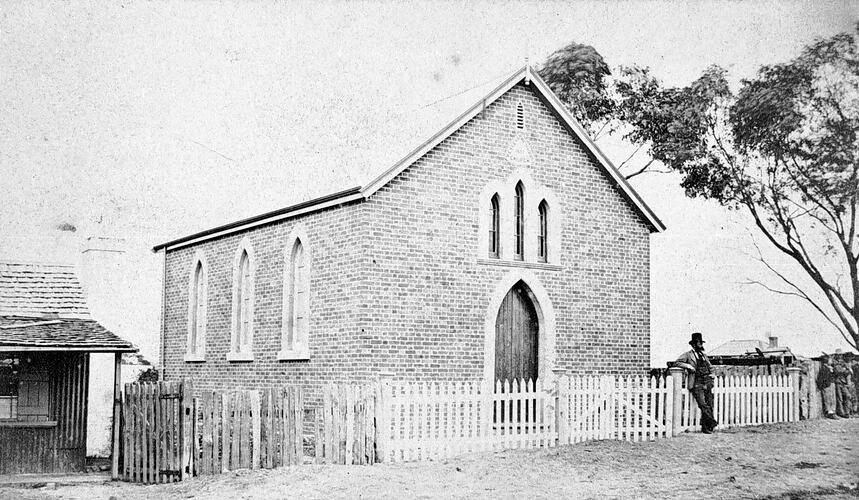 A man leaning on the picket fence in front of the Casterton Wesleyan Church.