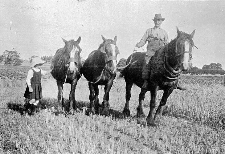 A man wearing boots and a hat, with a small girl who is wearing a school tunic, bringing in working horse team at the conclusion of ploughing. The three horses are attached by a set of reigns. There is a wire fence surrounding the area, and many large trees can be seen in the background.