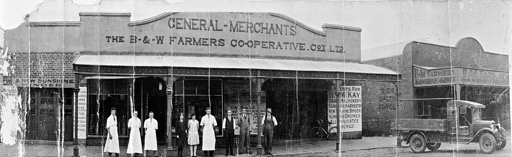Staff outside the general merchants, B.W Farmers Co-operative Company Limited. There is a truck parked beside the shop. The staff stand before the veranda which has wrought iron lace work and an iron roof, there is a bicycle sitting in front of the store to the right. The men are wearing suits with ties and the women are wearing dresses, four of the men appear to be wearing aprons.