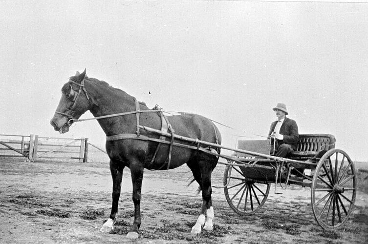 Man in horse and gig on 'Glenview' station. The horse's name was'Daien'. The man is wearing a suit with a hat. There is a wooden fence in the background.