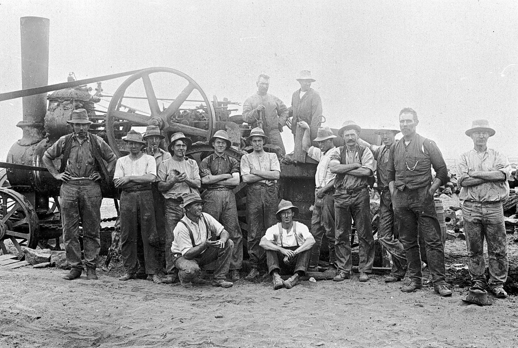 A group of men in front of a steam traction engine. Many of the men are wearing hats with vests and suspenders and boots. Two of the men are standing on the steam traction engine.