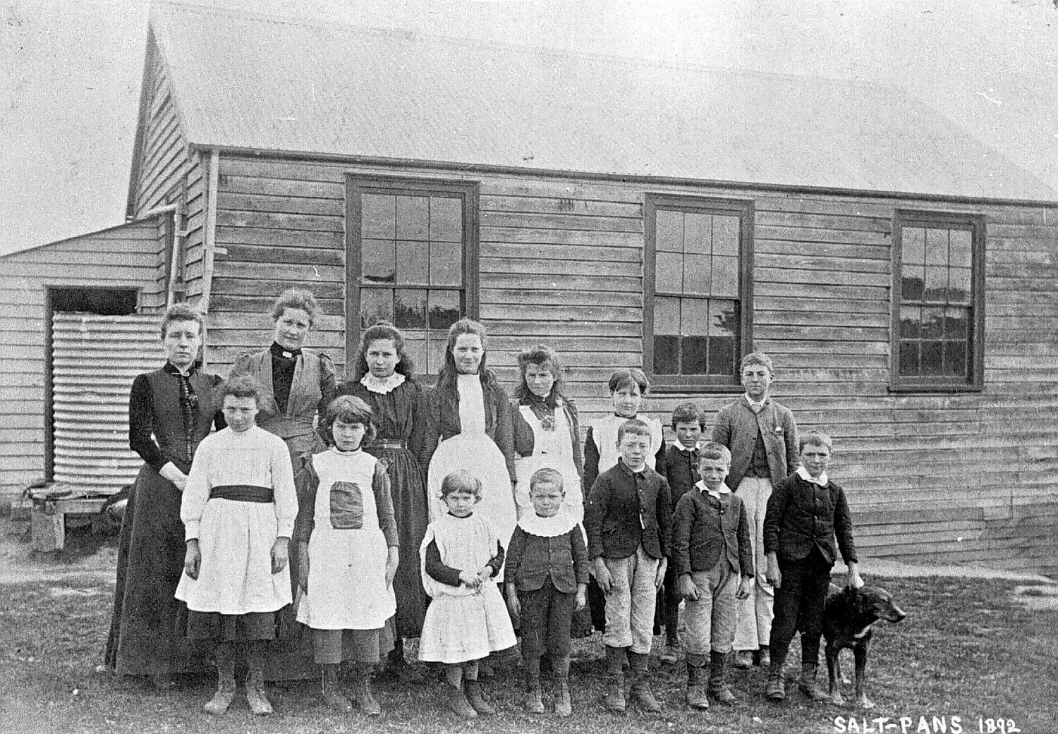 Teachers and pupils outside school. There is a water tank on the left. The teachers are wearing dresses, and the female students are wearing dresses and aprons. The male students are wearing boots with jackets and pants. The school building is Victorian timber, and there are three large windows. The roof of the building is iron. There is a dog standing to the right.