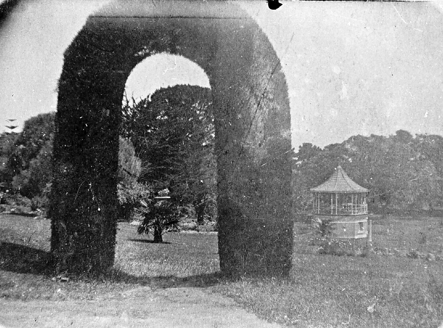 The Warrnambool Botanical Gardens with a topiary arch in the foreground and a rotunda in the background.