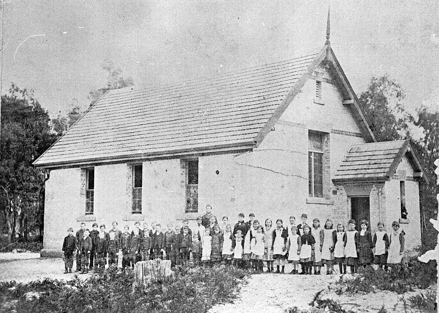 Teachers and pupils outside the Lal Lal State School, no 863. The school is a brick building with several large windows and a door on the right. The male students are wearing jackets and trousers, and the female students are wearing dresses. There are many large trees in the background.