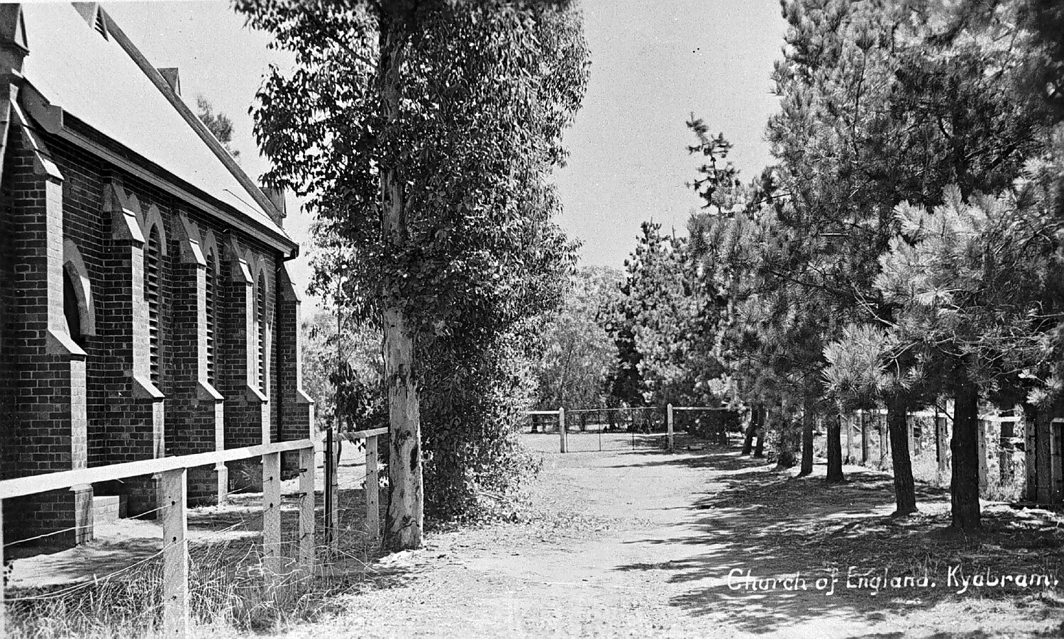 The Church of England, Kyabram on the left. There is an avenue of trees on the right. A wooden fence stands before the entrance to the Church.
