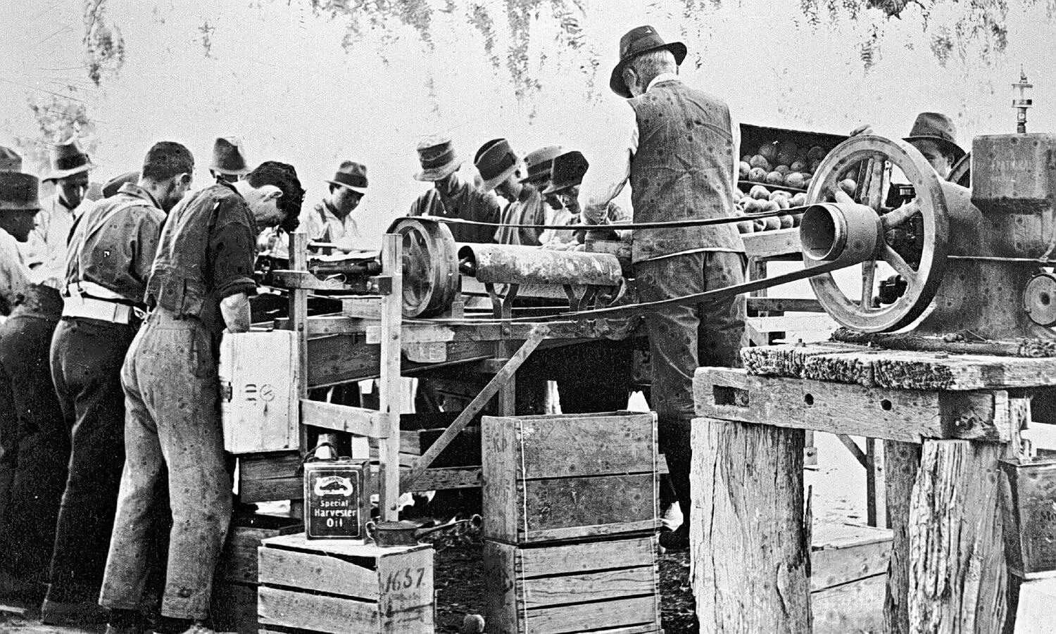 Men packing fruit which has been through 'The Lightning Fruit Grader.'. There is a tin of 'Special Harvester Oil' next to the machine.