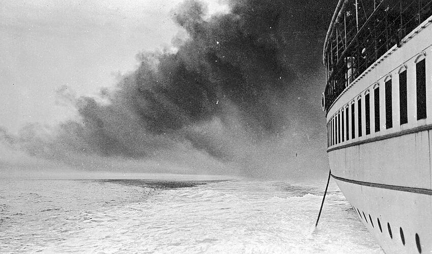 View of starboard side of stern and wake of paddlewheeks on the Paddlesteamer 'Weeroona', on Port Phillip Bay. The sky with very overcast with a rain squall approaching. A cable or rope is passing from the ship into the water.